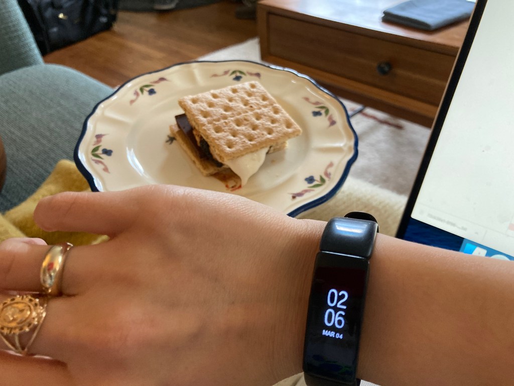2:06 PM. I’ve become obsessed with indoor s’mores (I think they might be my favorite dessert!?). My boyfriend’s apartment has a gas range, so toasting the marshmallows is especially easy to do here. We each have one and keep working.