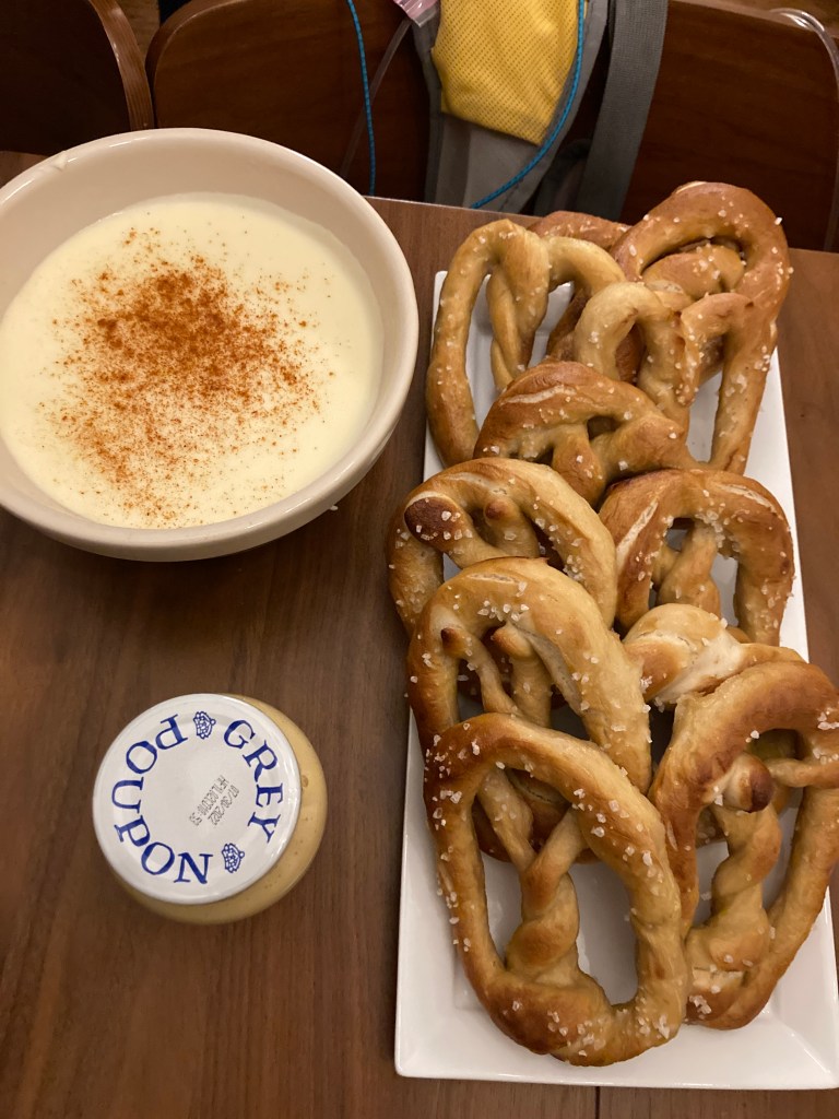 A little after 7 PM. We head over to the neighbors’ place, where the pretzels were a hit! We’d initially brought Coconut, but there was an almost-kerfuffle with the hosts’ dog, who’s much larger. I walked Coconut around the block to cool him down, dropped him back home, and then headed back to their place, where we stayed for the next three-ish hours.