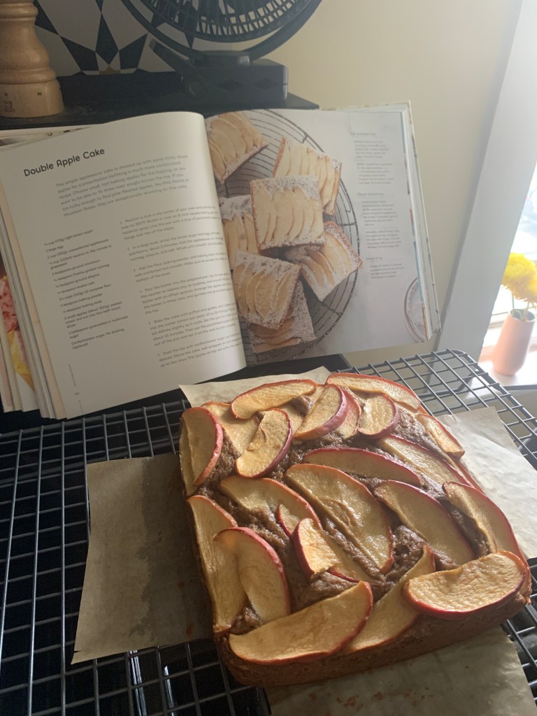 And finally two snacking cakes à la Yossy Arefi, whose cookbook Snacking Cakes was a birthday gift from last year: chocolate-almond olive oil cake (delicious, would make again!) and a double-apple cake (good, but I’d mainly made this to use up the leftover apple sauce from Latke Night).