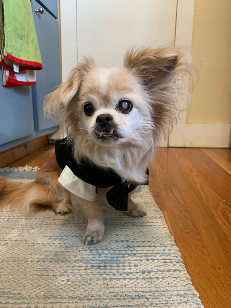 As usual, I’ll end with an assortment of photos from the last couple months: an outfit I loved featuring one of my grandpa’s sweaters; remains of my stolen bike (*sigh* Always lock the bike frame, not just the tire…); Coconut as the butler Alfred for Halloween; a candid from my boyfriend’s company holiday party; a minimalist unscented candle — I spent so long in an antique shop to find the plate that it’s resting on (isn’t it a perfect fit!?); and trying to get Coconut more comfortable with the dog backpack (peep his silly face!).