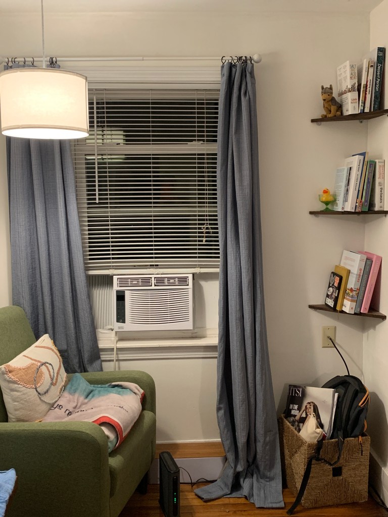 - Completed my first sewing project. I finally broke out the sewing machine that I’d bought two years ago (but never used) to complete a long-awaited home improvement project: convertible curtains! I loved the aesthetic of my long curtains, but when drawn they would block the window unit. I sewed a few toggle clasps to the back such that, when engaged, the curtain folds right above the top of the A/C. I’m not using it in “short mode” a ton right now, but during summer this’ll be fantastic.